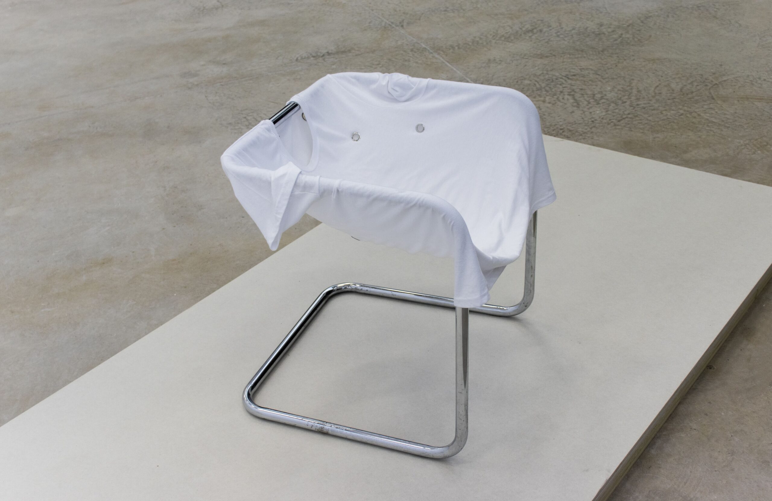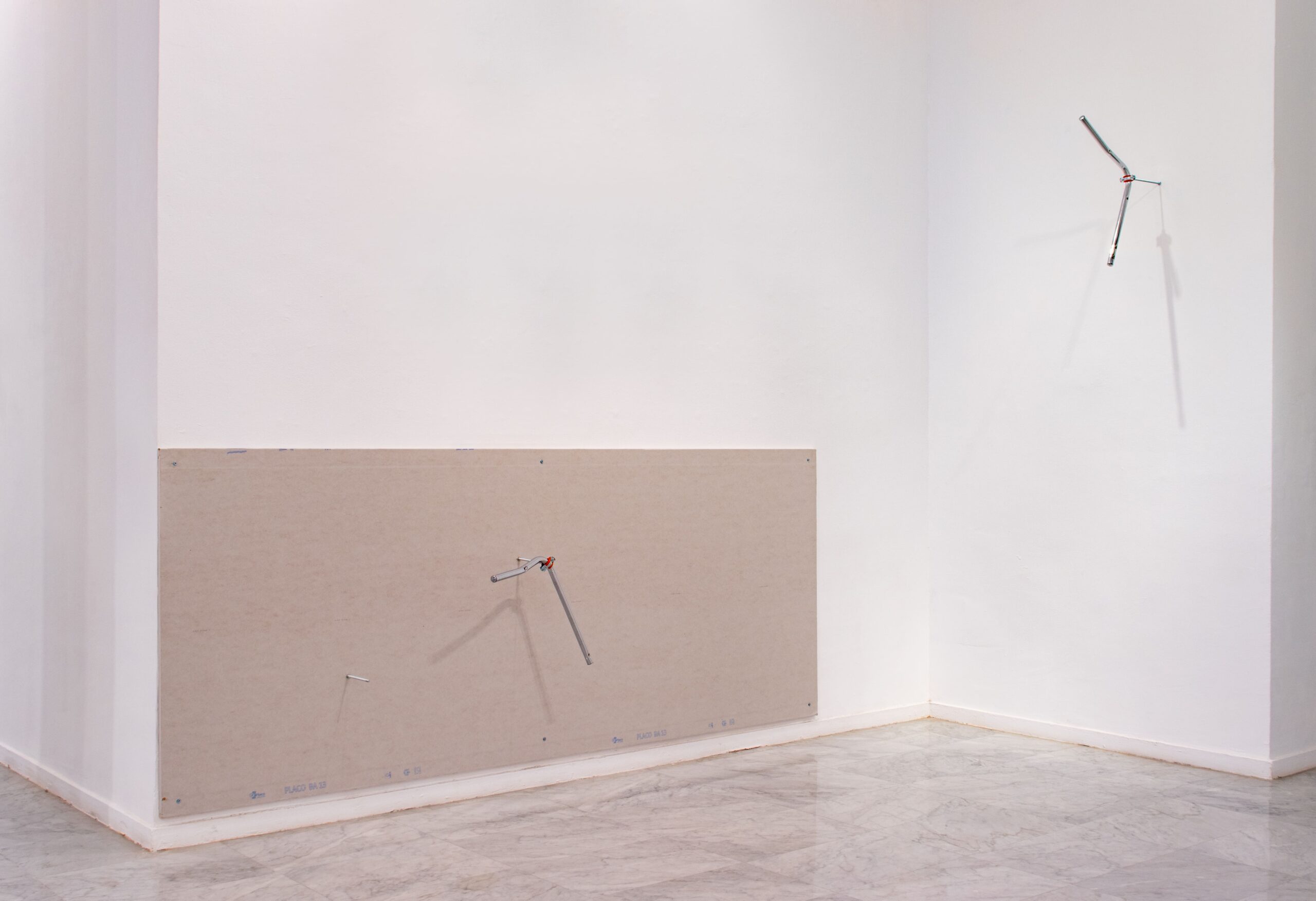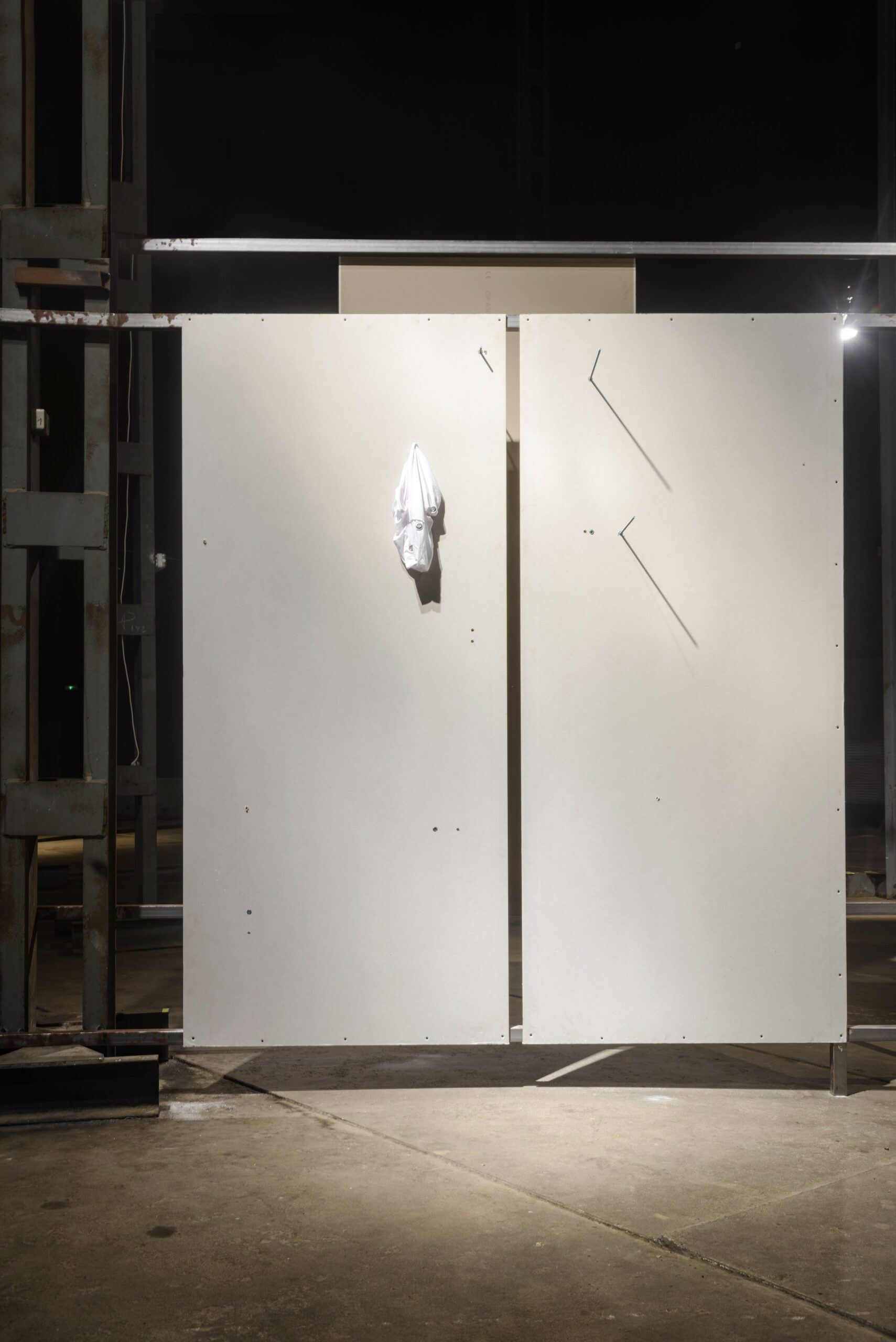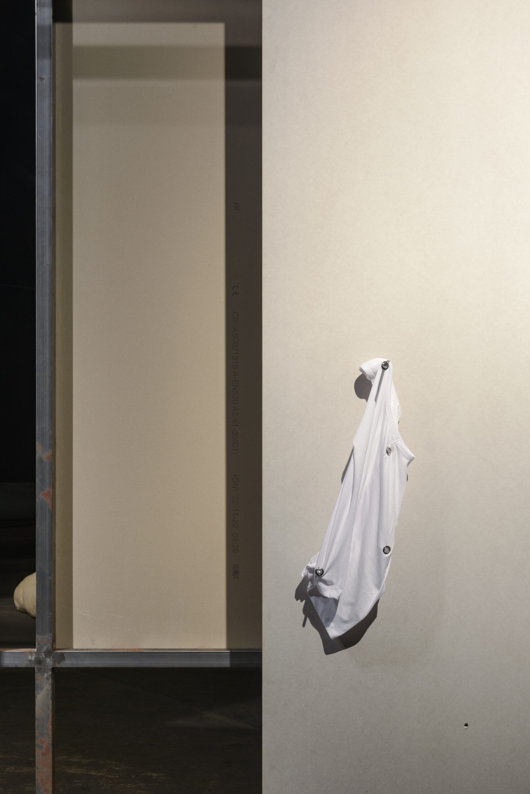 De la serie: aparato purificador. Camiseta de dos y tres palos, 2022. Intervención site-specific (Estructura de hierro soldada en jambas a los pilares del espacio). Hierro, cartón, yeso, camisetas y ojales de metal