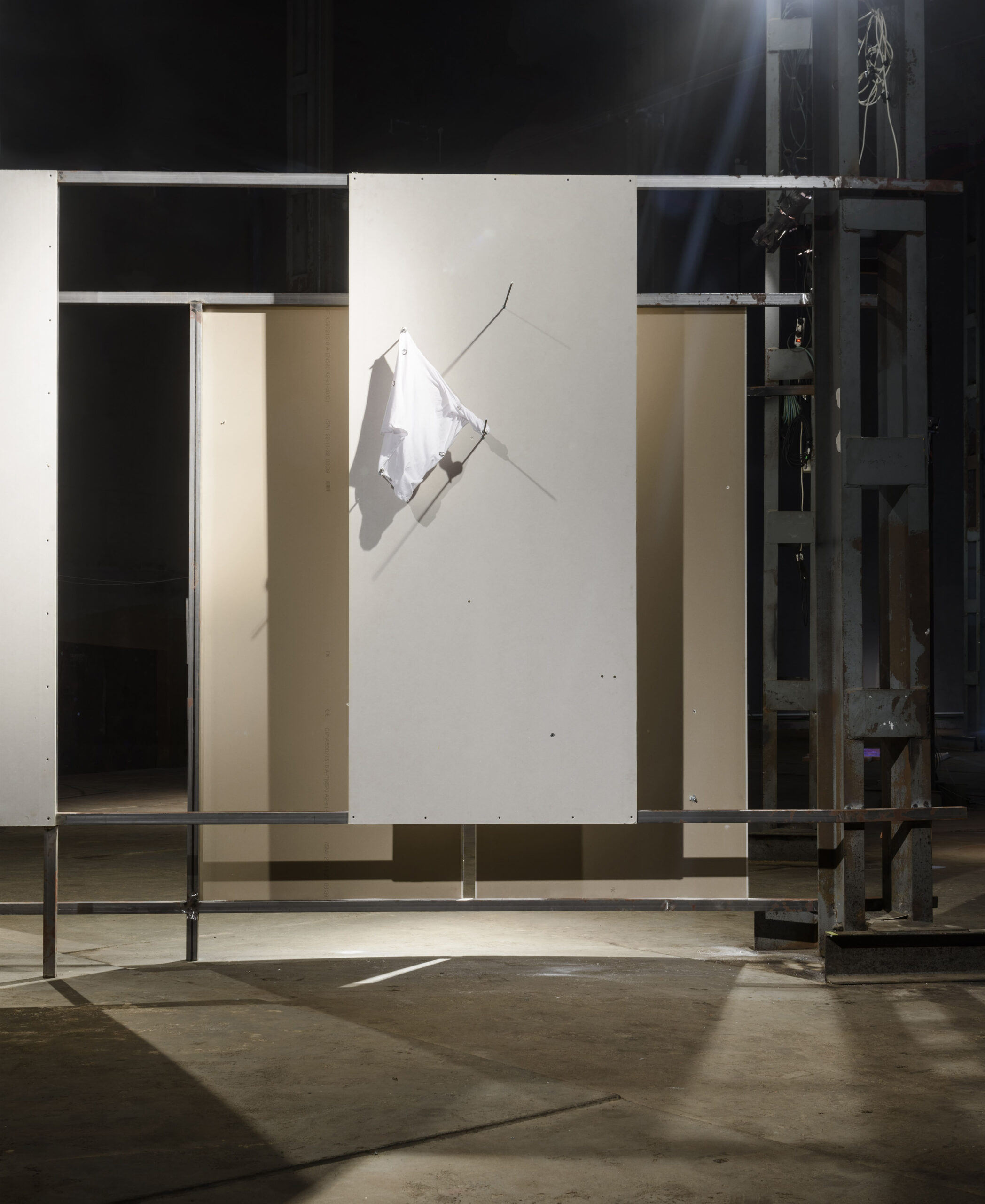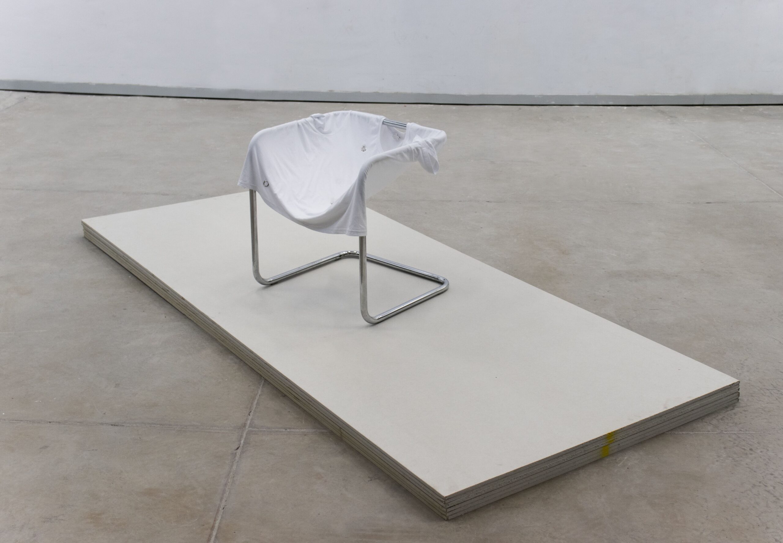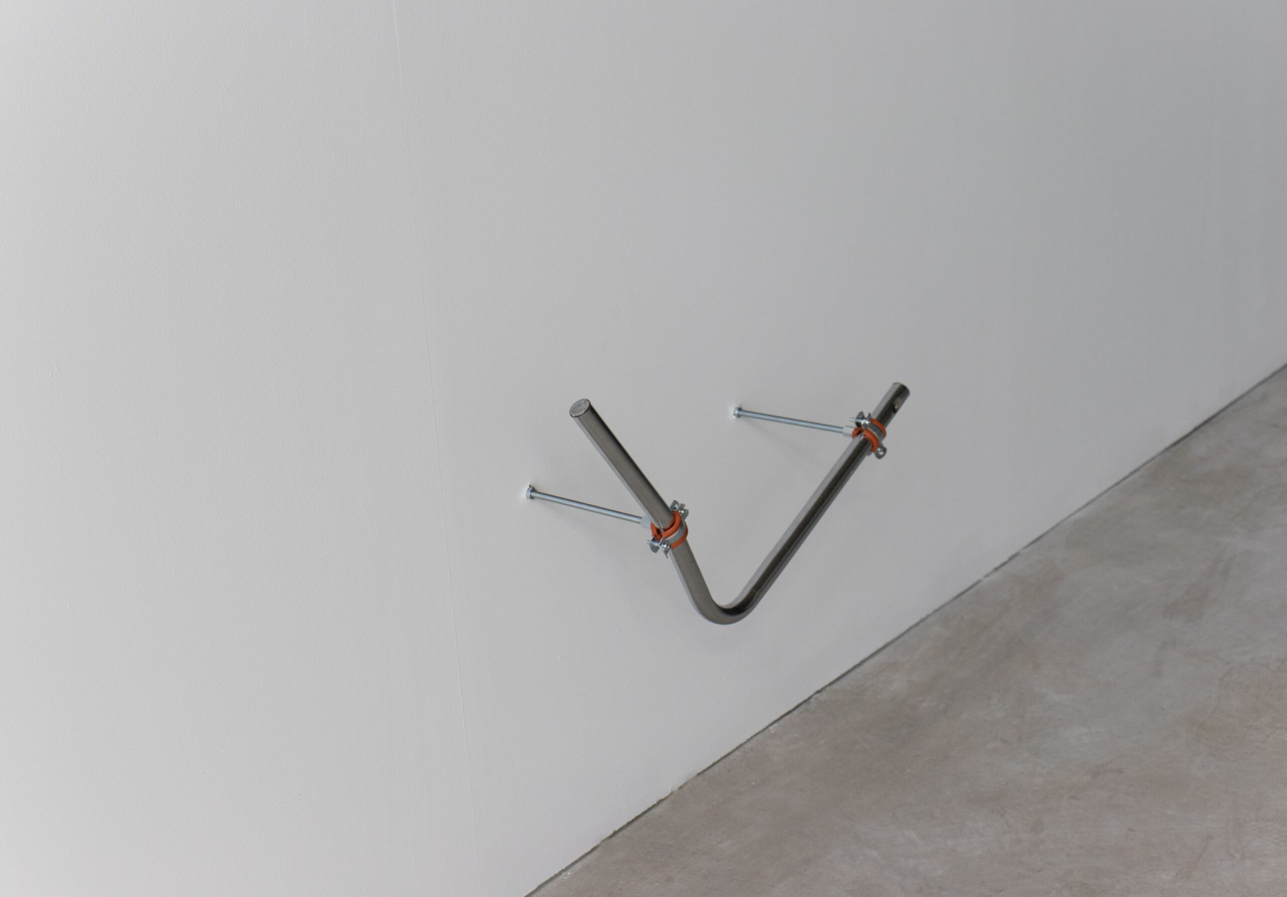 De la serie: aparato purificador. Camiseta de dos y tres palos, 2022. Intervención site-specific (Estructura de hierro soldada en jambas a los pilares del espacio). Hierro, cartón, yeso, camisetas y ojales de metal