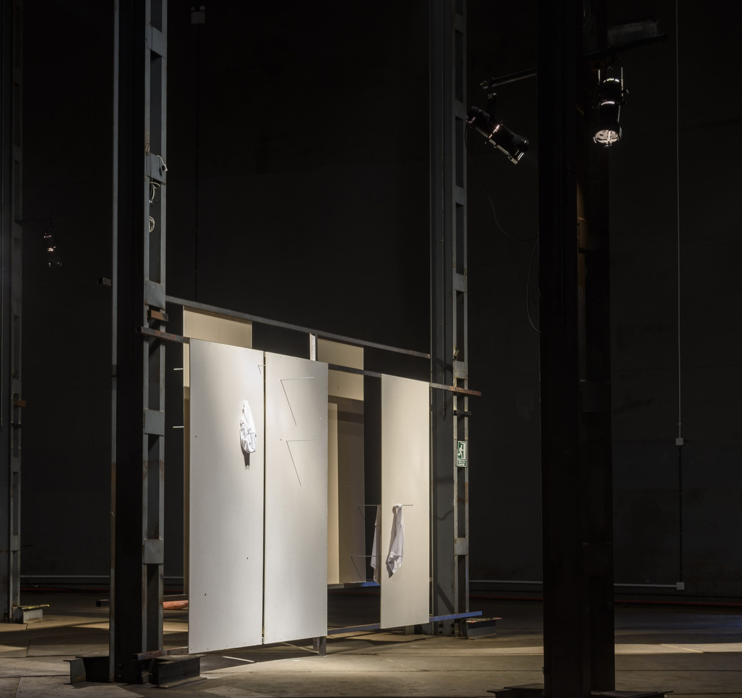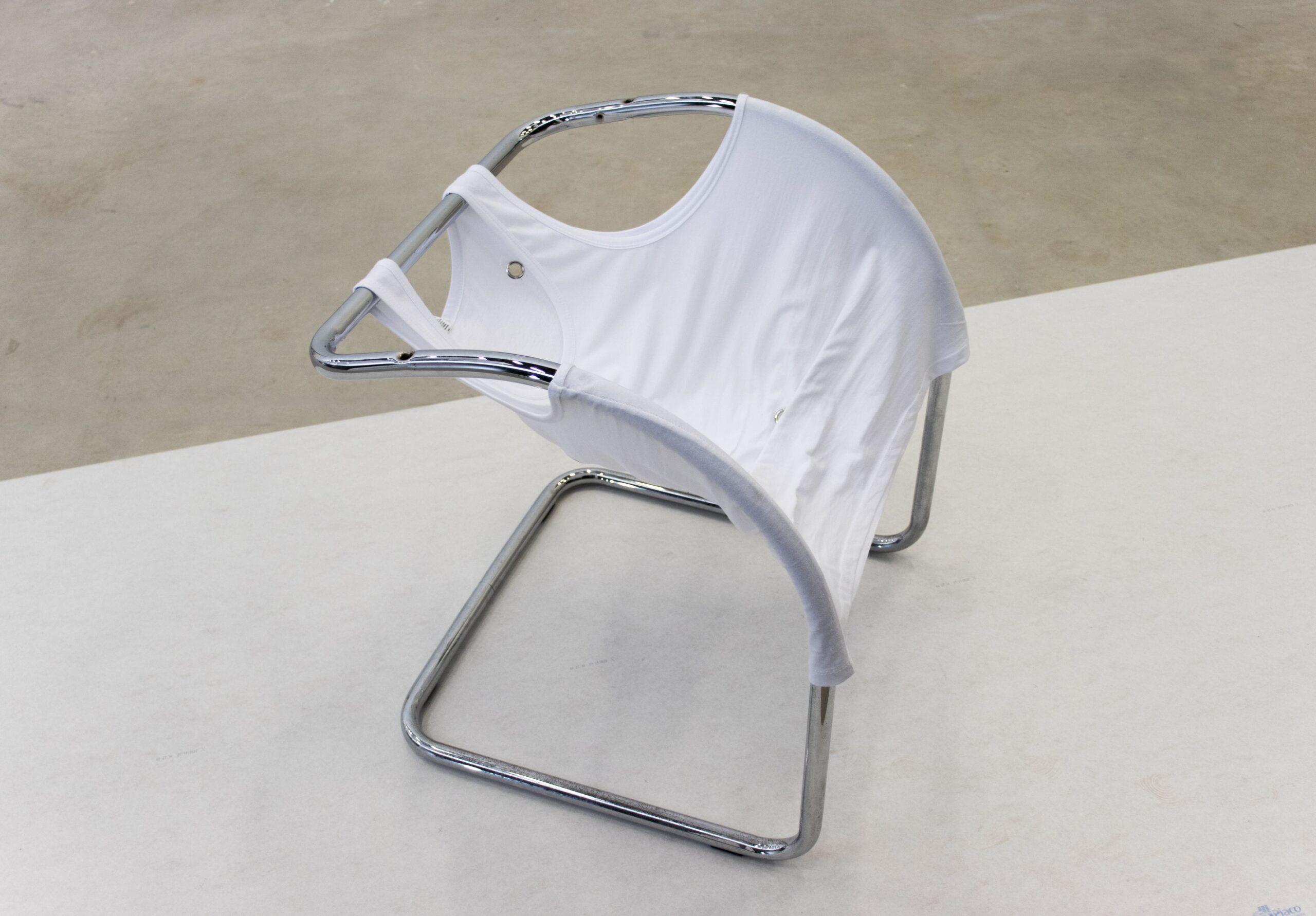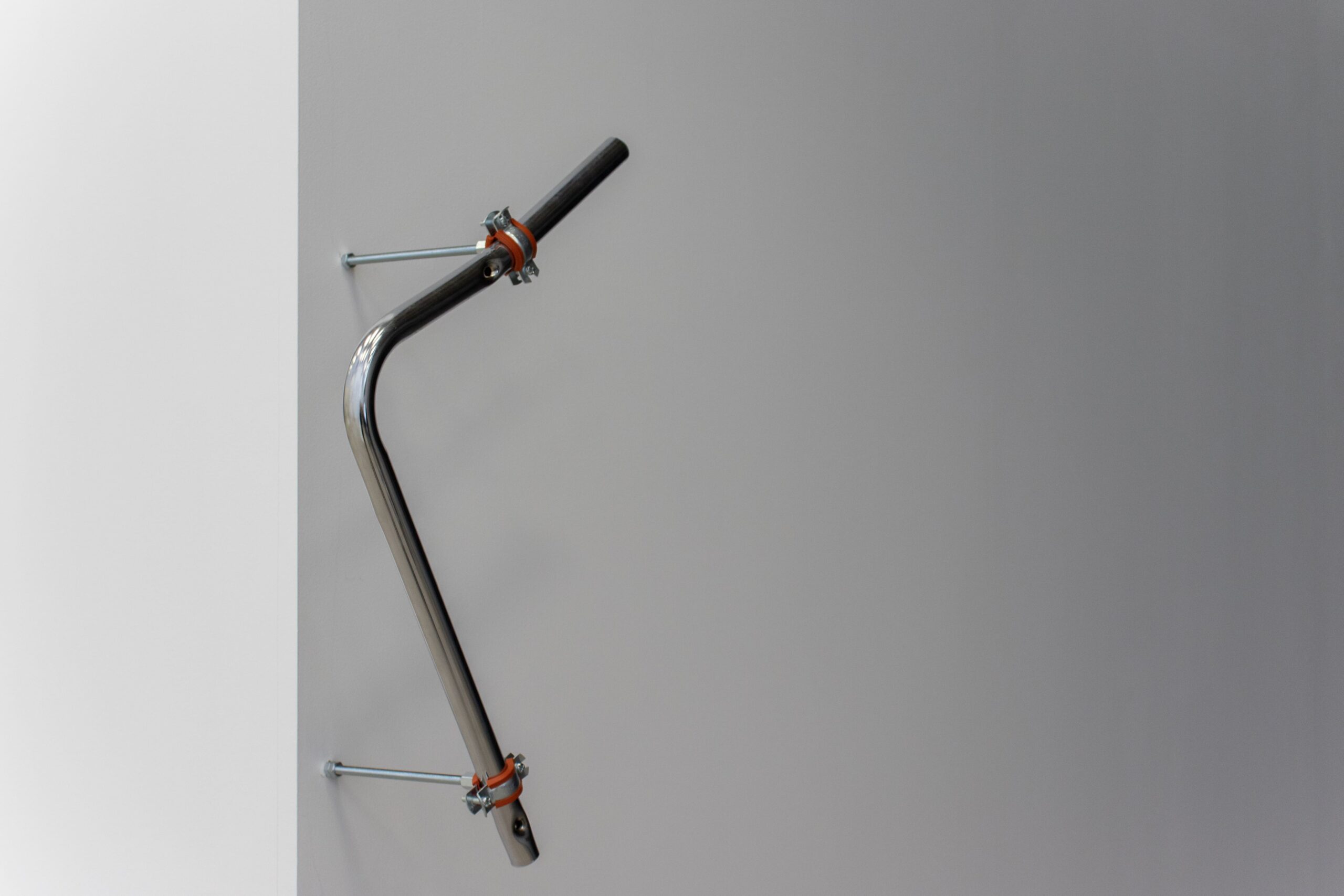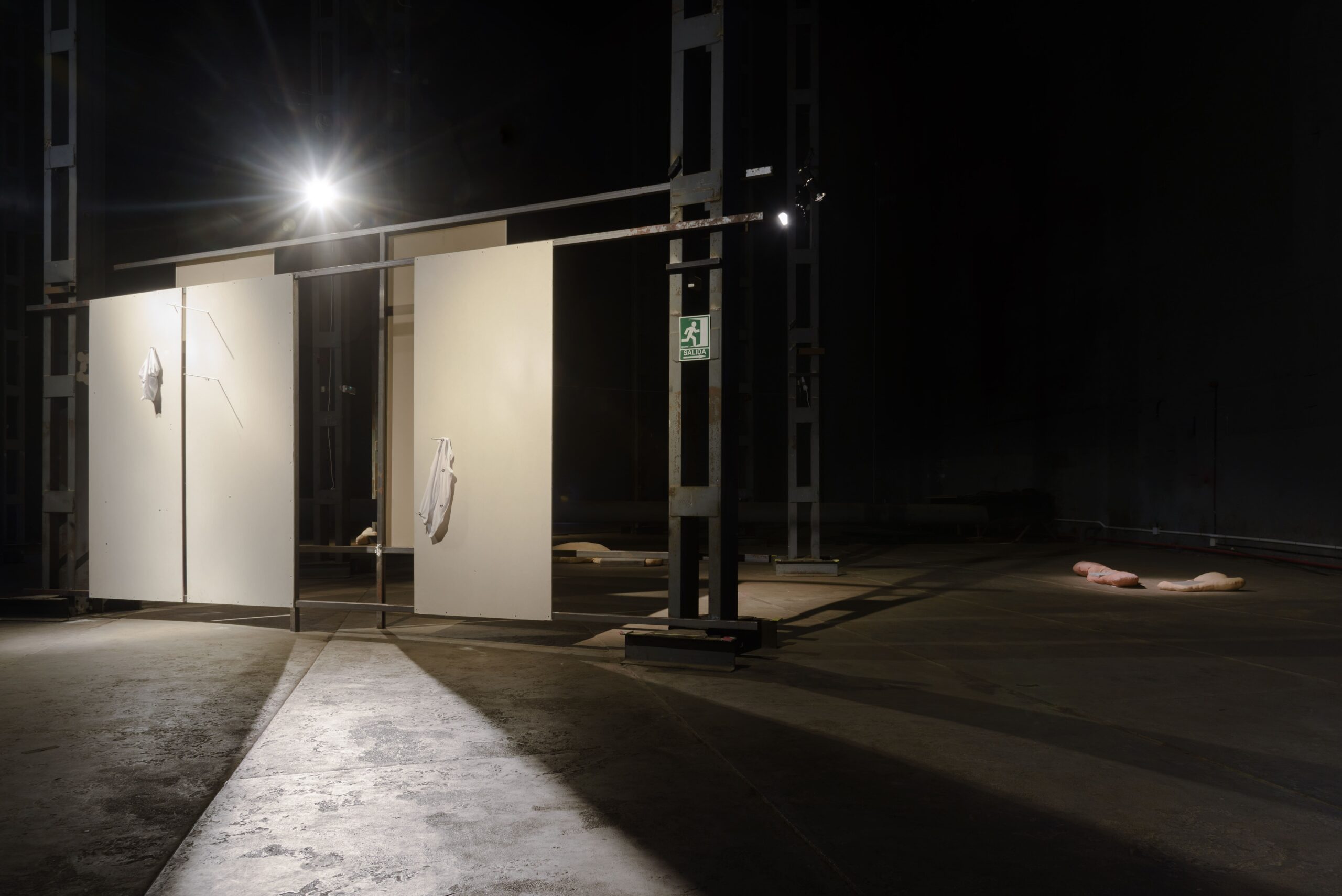 De la serie: aparato purificador. Camiseta de dos y tres palos, 2022. Intervención site-specific (Estructura de hierro soldada en jambas a los pilares del espacio). Hierro, cartón, yeso, camisetas y ojales de metal