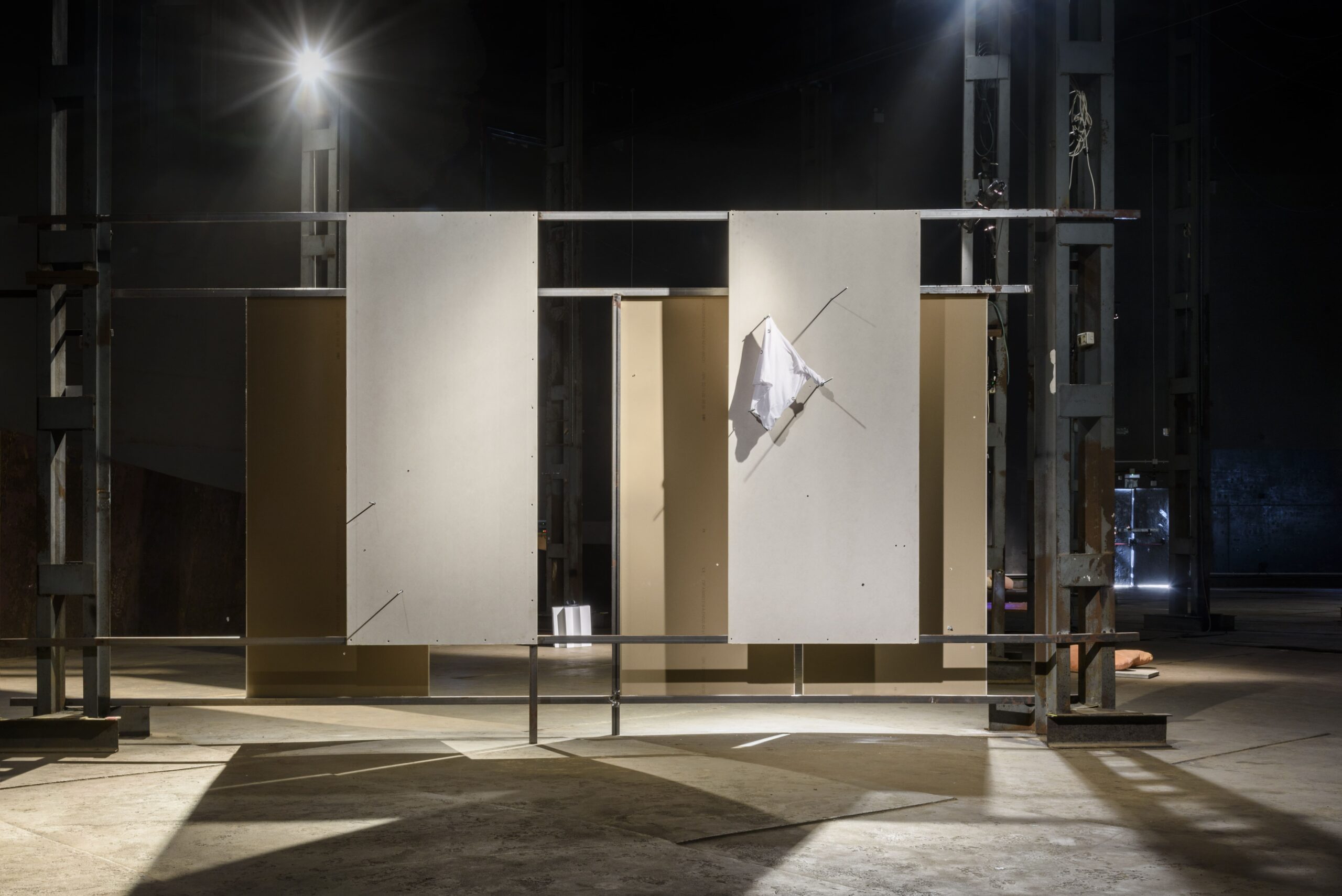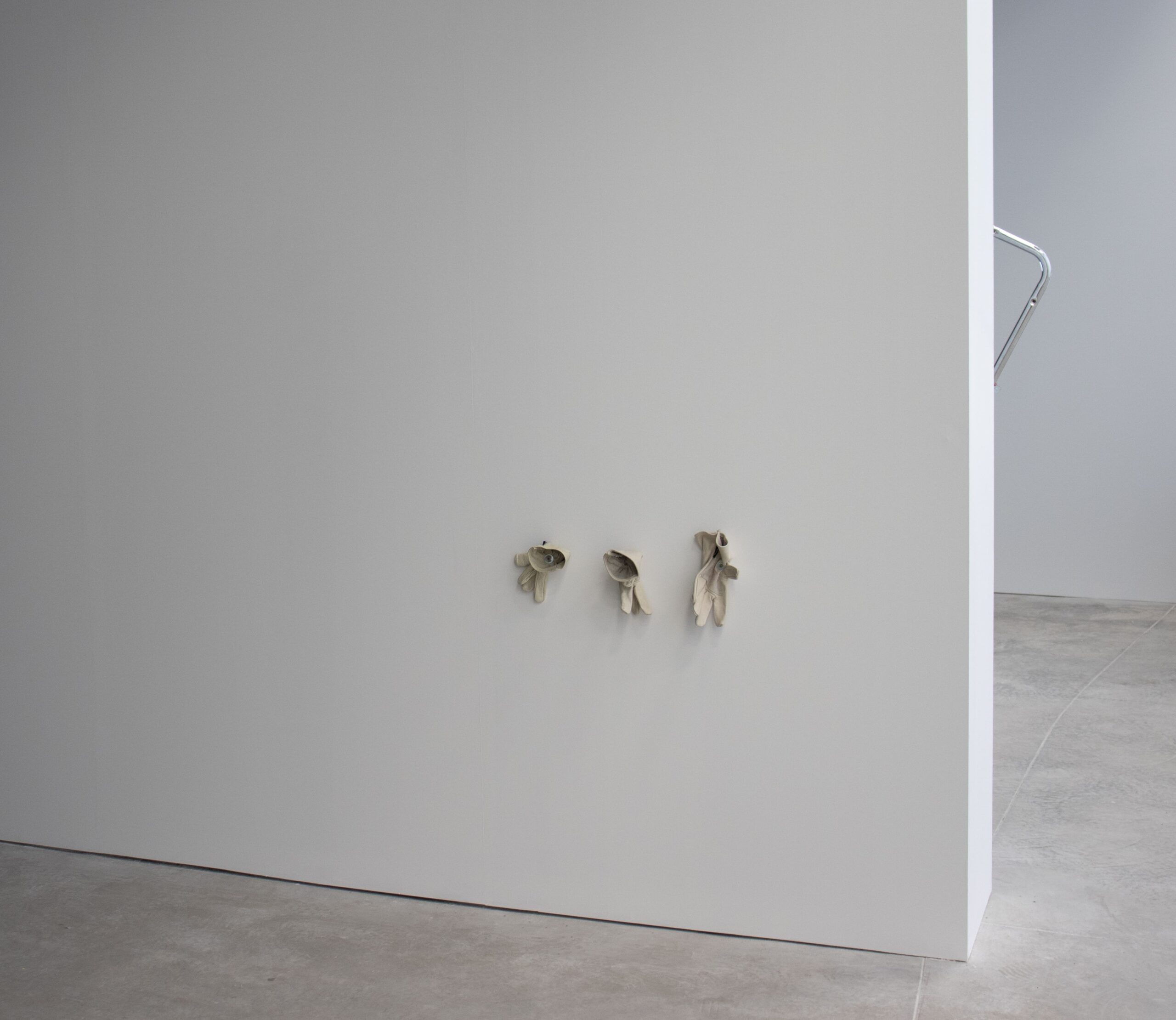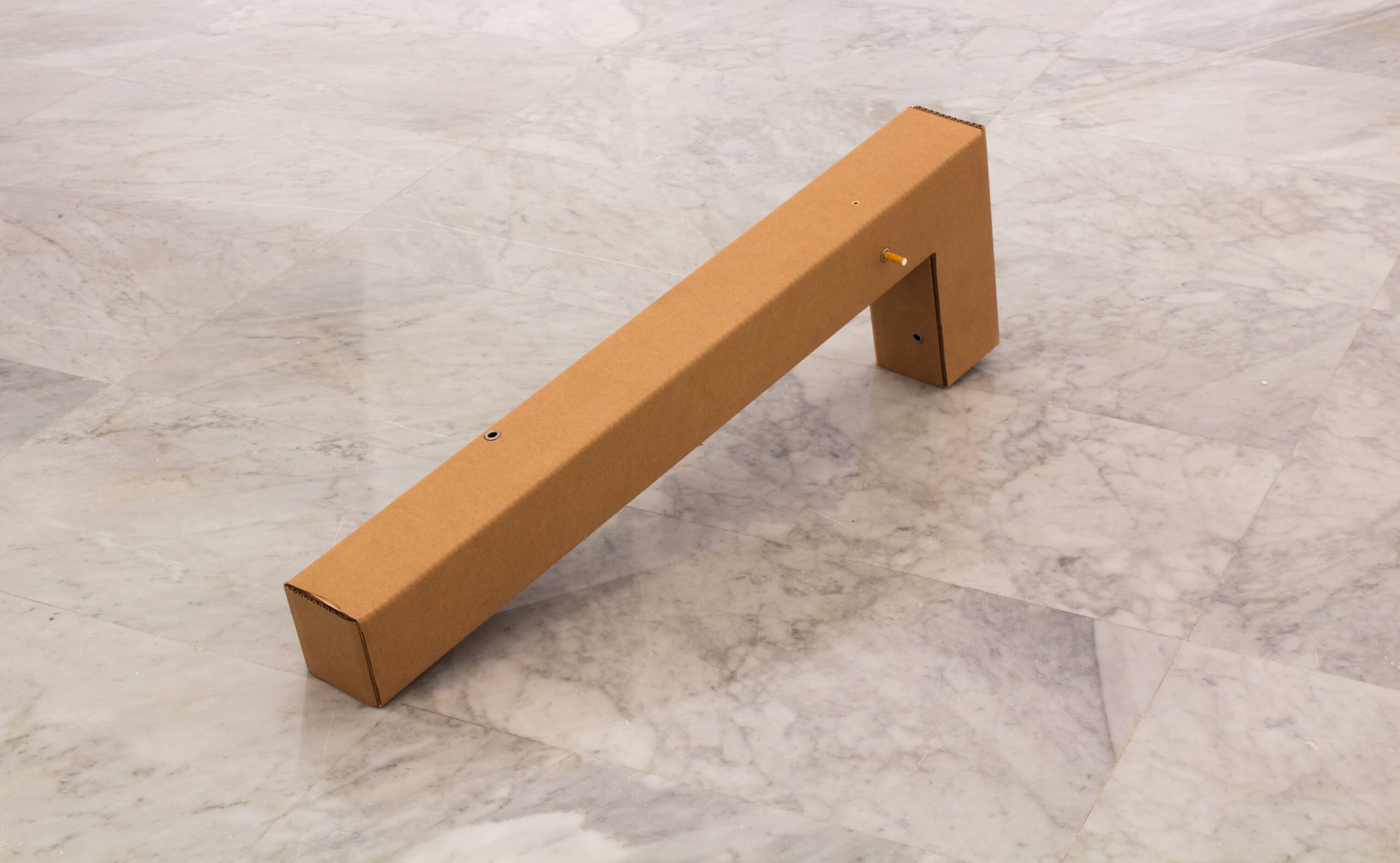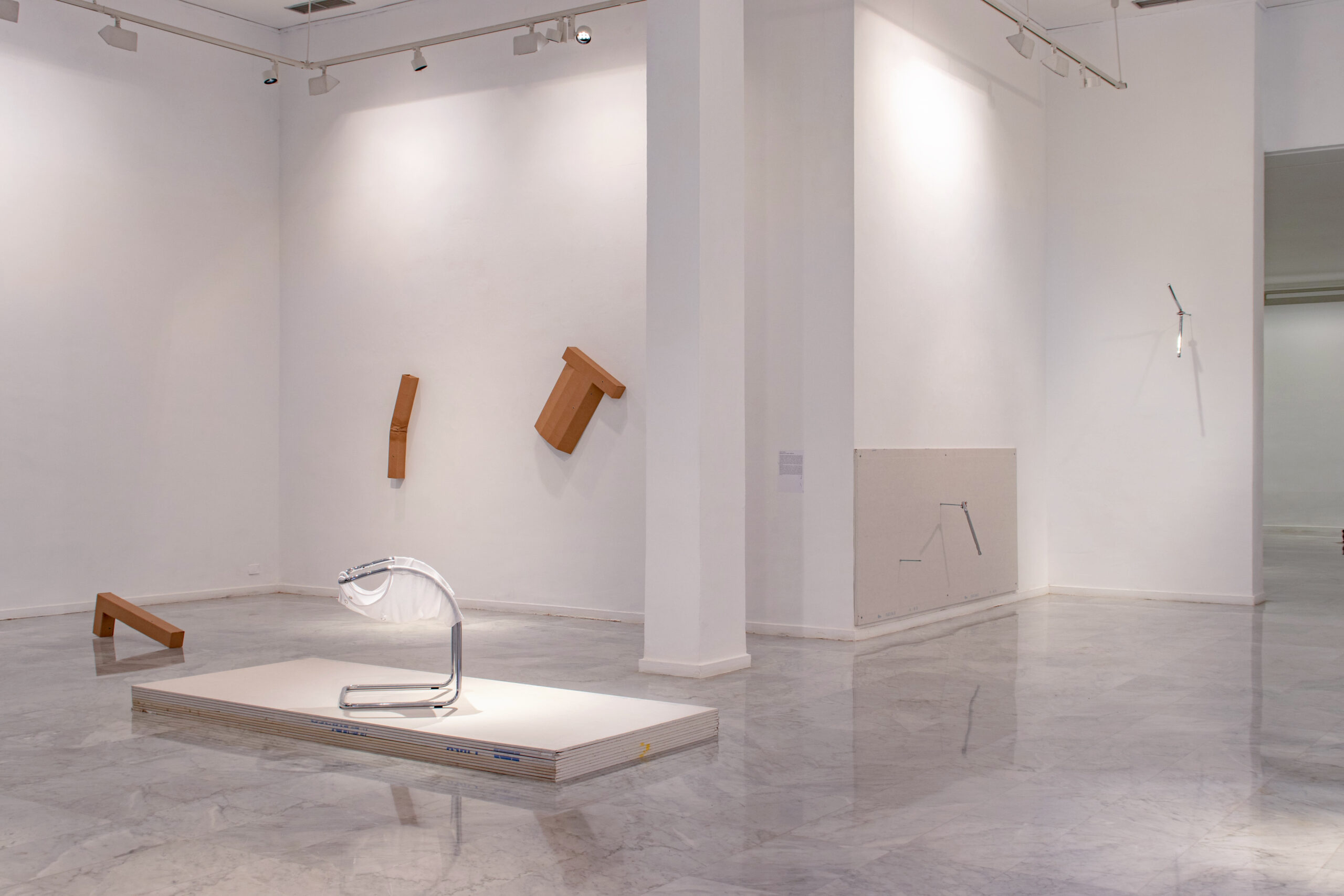 De la serie: Aparato purificador. Sentarse en el cuadro. Sin título, 2023. Cartón, yeso, metal. Intervención site-specific